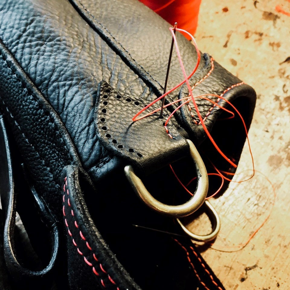 Uniquely stunning black shoulder bag. Hand-crafted and sewn with crimson Tiger thread for extra detail.