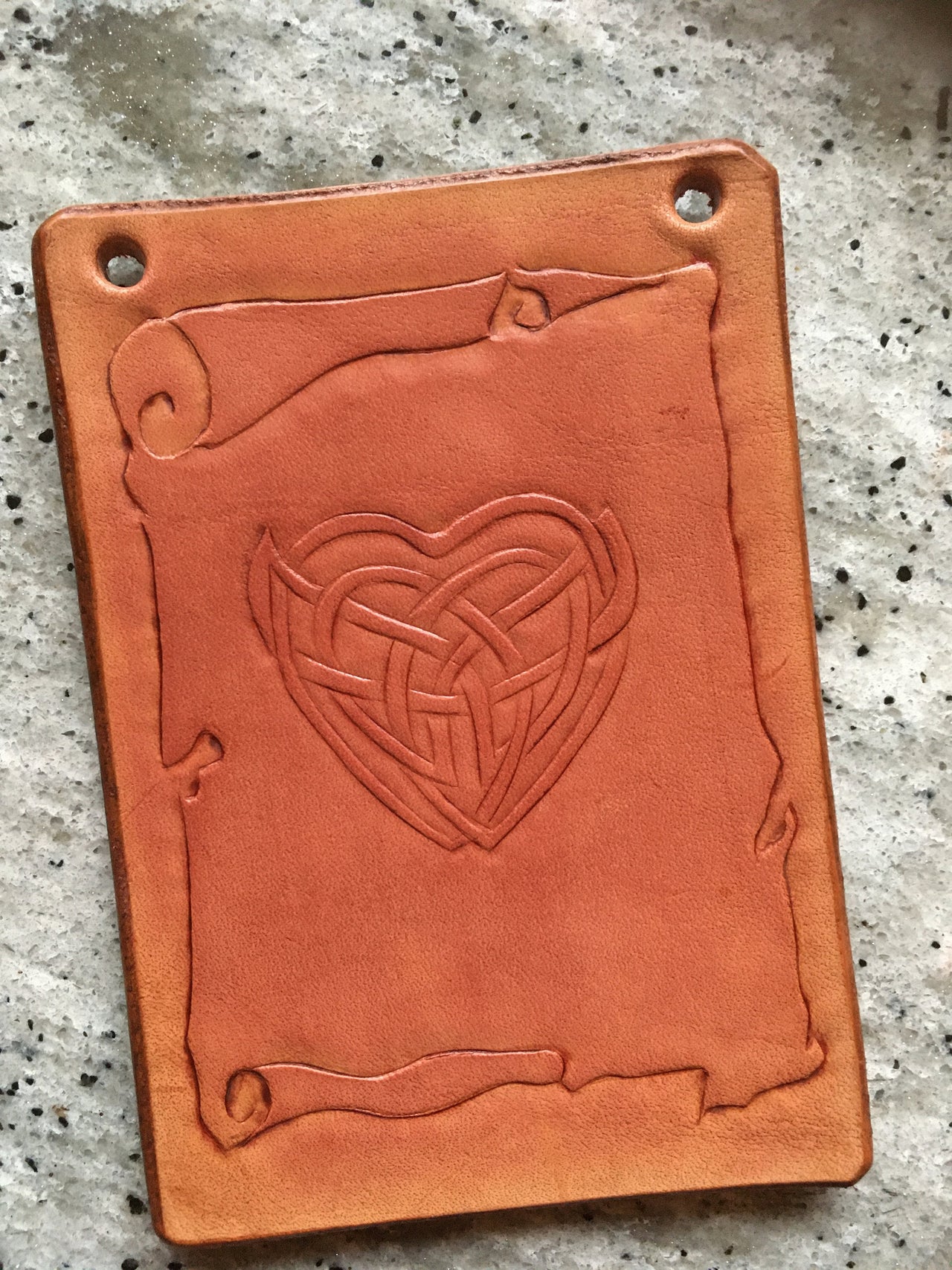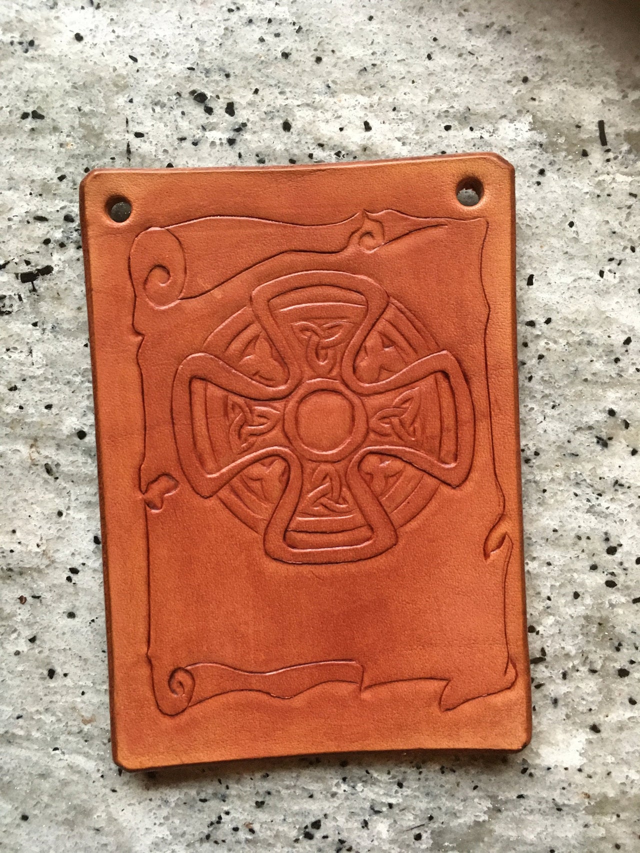 Hand carved leather scroll / tablets. Created with love and care, a miniature series each having a Celtic design.